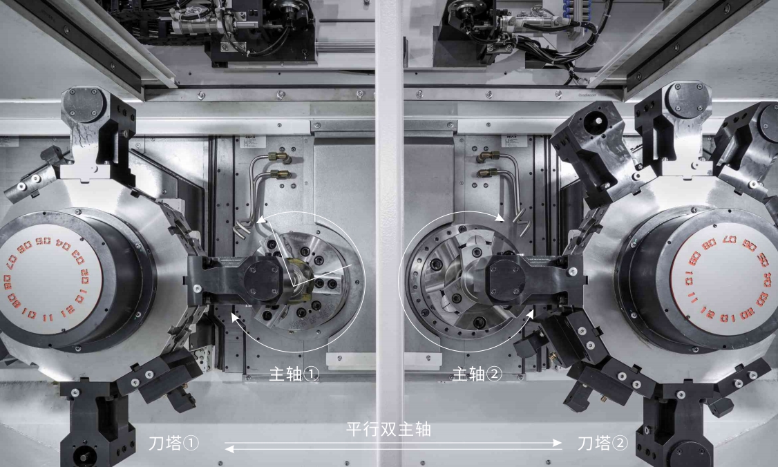 【雙倍加工能力】雙主軸雙刀塔結構可以同時加工兩個工件,或一個工件2序同時加工,可大幅提供加工效率。